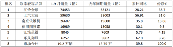 根据中汽协数据,2021年1-9月欧系轻客销量、同比及市场份额: