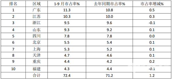 2021年1-9月欧系轻客主要流向广东、江苏、浙江等客货两用及物流业比较发达的区域,前10名区域累计占比72.4%,同比占比增加1.2%,成为今年1-9月欧系轻客市场的主要贡献者。为何?