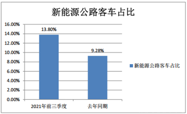 2、2021年前三季度新能源公路客车占据公路客车大盘的份额为13.8%,高于去年同期的9.28%近4.52个百分点。