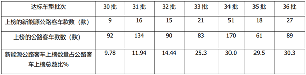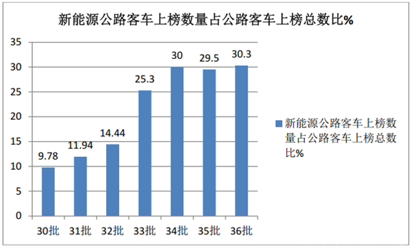 近来交通部发布的公路客车达标车型(30-36批)中新能源公路客车占比统计(数据来源:交通部):