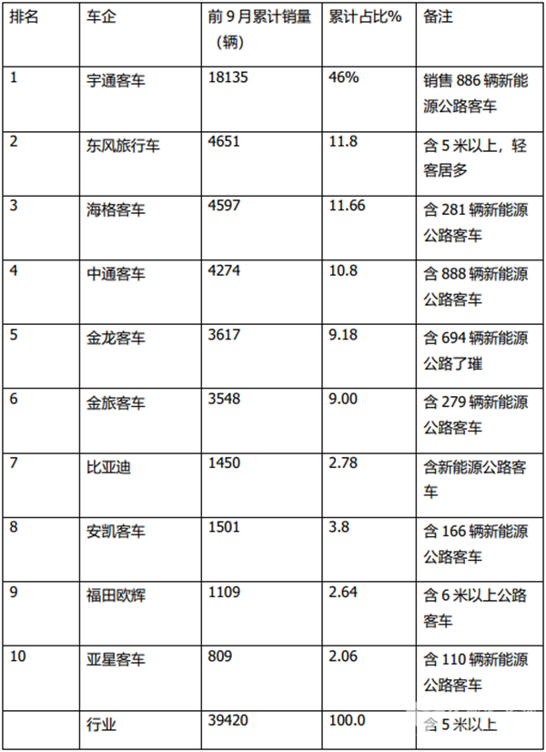 三是新能源公路客车大涨,对促进今年前三季度公路客车市场的增长起到了添砖加瓦的作用。
