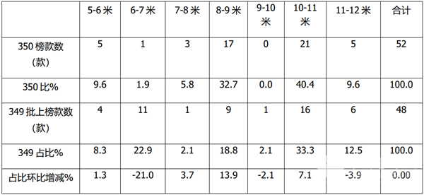 根据第350批上榜车型数据统计,各长度段上榜车型数量及占比: