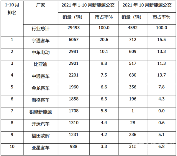 从上表看出,2021年10月及1-10月,在新能源公交客车主流企业销量TOP10中特点分别如下: