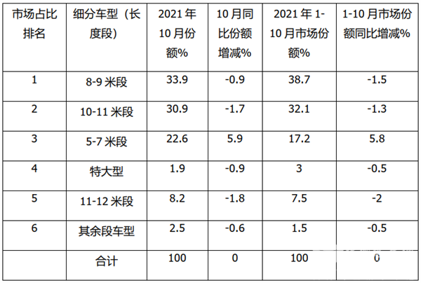 上表可见,在2021年10月及1-10月新能源公交客车各长度段(细分车型)销量占比中,呈现以下特点: