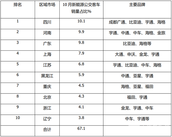 特征五、新能源公交客车市场分布不均衡。从全国区域市场分布看,10月四川占比最高,河南居第二,广东获第三;前10月广州、重庆、成都位居前三甲城市