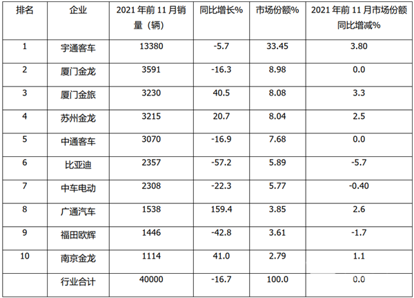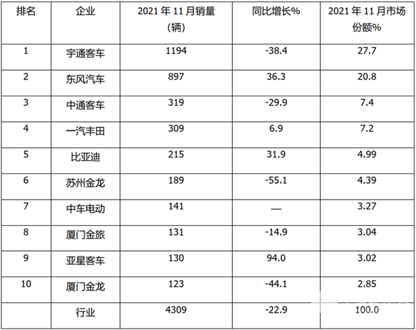 上表可见,在2021年前11月中型客车销量top10中: