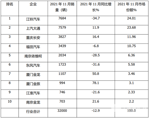根据中汽协数据,2021年11月轻型客车销售3.2万辆,同比下降12.9%,2021年11月TOP10企业轻型客车销量、同比及份额统计: