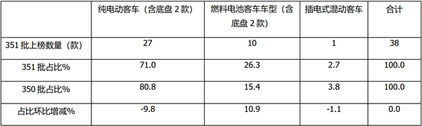 上表可见,在第351批公告中,按技术路线划分,纯电动客车(含底盘2款)上榜车型27款,占比71%,占据绝对的主导地位,但占比环比减少9.8个百分点,是占比环比减少最多的车型;