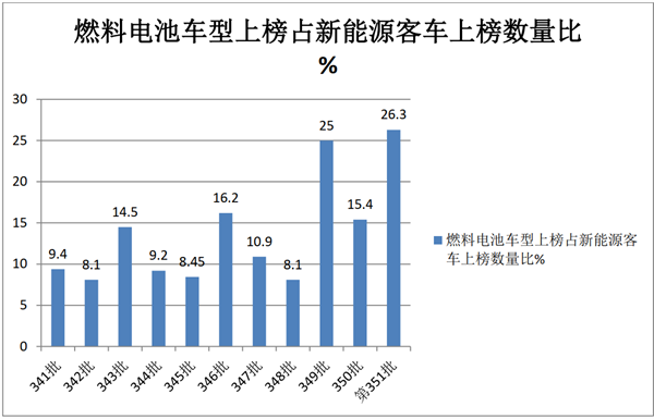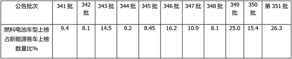 上图表说明,燃料电池客车在近期工信部发布的公告中,占比忽高忽低,波动较大,从第341批的9.4%波动到第351批的26.3%,其中第351批占比为最高,这是第351批新能源客车新品公告中一大特点。