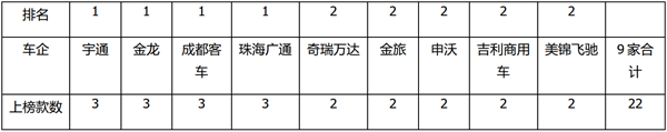 特点三、宇通、金龙、成都客车、珠海广通均上榜3款,并列第一