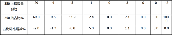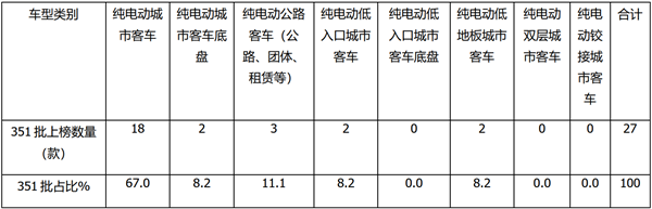 根据第351批公告数据,按目标用途划分上榜的42款(含4款底盘)纯电动客车车型类别结构占比及占比环比增减统计: