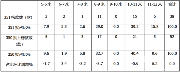 根据第351批上榜车型数据统计,各长度段上榜车型数量及占比: