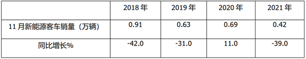 上表可见,2021年11月新能源客车终端上牌销量在近4年同期中处最少,同比降幅也处于第二大,也就是今年的11月新能源客车终端市场并不太理想。