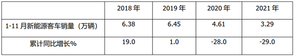 上表可见,2021年前11月新能源客车终端上牌销量为3.29万辆,比去年同期还少1.32万辆,在近4年同期中处于最低,同比下降29%,降幅在近年同期中居于第一大,可以认为今年前11月新能源客车终端市场是近年同期最差、处于近年同期最为惨淡的年份,具体原因是: