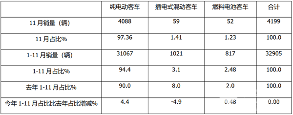 2021年11月及1-11月按技术路线划分,新能源客车销量结构(数据来源:上牌信息):