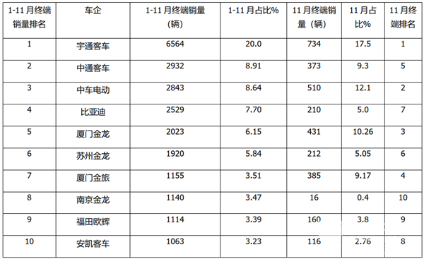 上表可见,在今年11月及1-11月新能源客车终端上牌销量中,宇通客车均是一家独大,居于冠军;