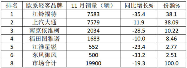 总体看,11月欧系轻客销量1.99万辆,同比下降19.3%,江铃全顺、上汽大通、南京依维柯为前三,TOP6中同比1增5降。
