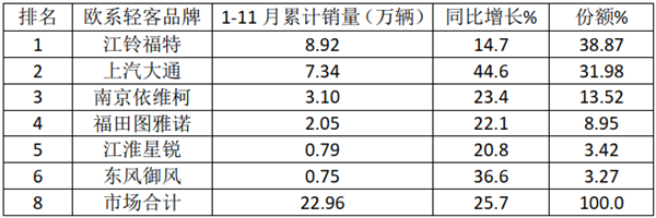 根据中汽协数据,2021年1-11月欧系轻客销量、同比及市场份额:
