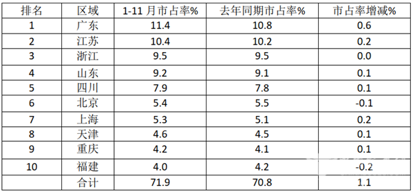 可见,2021年1-11月欧系轻客主要流向广东、江苏、浙江等客货两用及物流业比较发达的区域,前10名区域累计占比71.9%,同比占比增加1.1%,成为今年1-11月欧系轻客市场的主要贡献者。为何?