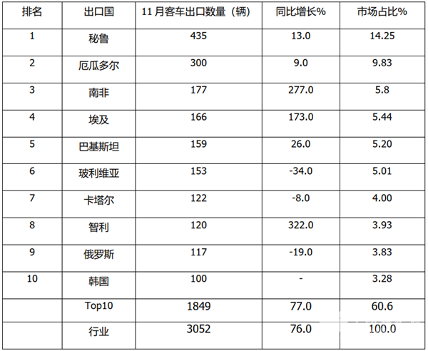 2、2021年1-11月我国客车出口国top10排行(数据来源:海关):