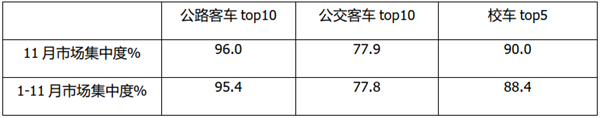 上表可见,2021年11月份,首先是公路客车TOP10达到96.0%,集中度为最高(主要是“两通三龙”);其次是校车,校车前5名市场集中度达到90.0%,说明校车已经越来越集中到少数几家企业销售了(主要是宇通客车一家占比超6成),垄断程度最高;最低的是公交市场,TOP10占比为77.9%;