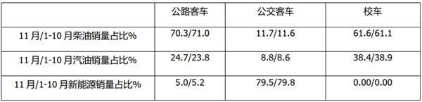 根据终端上牌数据(扣除福田5-6米轻客),2021年11月及1-11月5米以上公路客车、公交客车及校车三大细分市场中柴油、汽油及新能源占比情况统计: