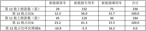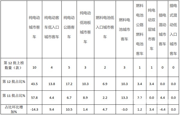 上表可见,在2021年第12批新能源汽车推荐目录入选车型中,新能源客车上榜29款车型,占比12.3%,比占比最多的新能源专用车少近 43.7个百分点,比占比第二的新能源乘用车占比少近19.5个百分点,居于最小,且占比环比减少10.9个百分点,是占比环比减少最多的细分车型。