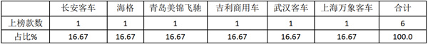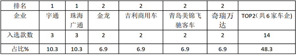 宇通和珠海广通客车均上榜3款,并列第一,占比均为10.3%;