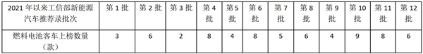 上表可见,从2021年工信部发布的共计12批新能源汽车推荐目录看,第12批次目录上榜的燃料电池为6款,居于第三多(与第2批和第8批并列第三)