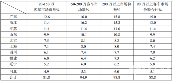 1、广东、浙江、江苏、山东、北京等TOP10市场是90万以上高档客车市场的主要需求市场,集中度比较高。需求比例占整个高档客车市场的88.8%,其他23个区域市场销售高端客车只有近11.2%的市场机会;