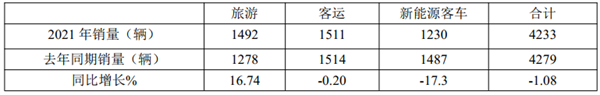 四是由于疫情影响,2021年有些旅游线路营运市场仍然没有恢复到疫情前的状态,导致旅游客车市场受到影响,从而影响了高档旅游客车市场的销售;