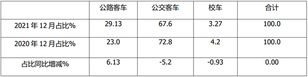 根据慧眼看车数据(扣除福田5-6米轻客产品),2021年12月公路、公交、校车占比及占比同比增减统计: