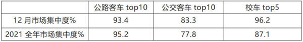 上表可见,2021年12月份,首先是校车集中度最高,达到96.2%(主要是宇通一家 接近7成)。其次是公路客车TOP10达到93.4%(主要是“两通三龙”);最低的是公交市场,TOP10占比为83.3%;