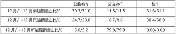 根据终端上牌数据(扣除福田5-6米轻客),2021年12月及1-12月5米以上公路客车、公交客车及校车三大细分市场中柴油、汽油及新能源占比情况统计: