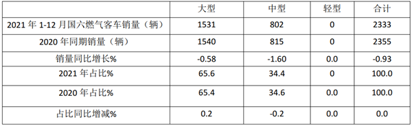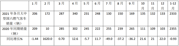 根据终端上牌数据,2021年全年国六燃气类客车累计销售2333辆,同比(2021年同期销售2355辆)下降0.93%。现对2021年国六燃气类客车市场(含大中型)特点作扼要小结,供业内参考!