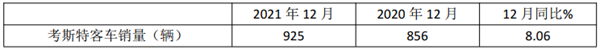 上表显示,2021年12月考斯特客车销量925辆,环比下降10%,同比增长8.06%。
