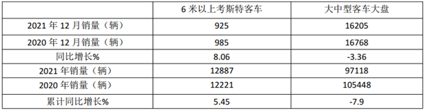 2、根据终端上牌数据,2021年12月考斯客车销量同比如下表: