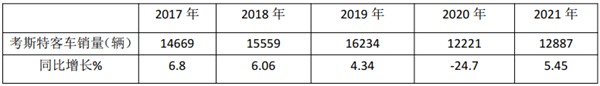 上表显示,2021年考斯特客车销售12887辆,在近5年中居于第四,仅仅比最差的2020年销量略高一些,也就是2021年的考斯特客车市场并不是太好。主要由于疫情反复、旅游客运市场尚未完全恢复等原因导致的。