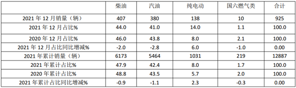 根据终端上牌数据统计,按燃料种类划分,2021年12月及全年考斯特客车销量结构: