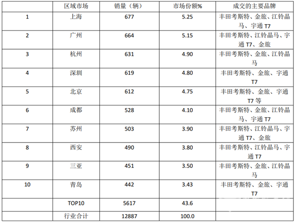 上表可见,在2021年全年,考斯客车流向TOP3区域市场是上海、广州和杭州,TOP10累计销售占比43.6%。