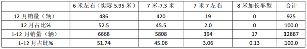 特征五、无论是2021年12月还是全年,6米段销量均占比超半壁江山,占市场主导地位,其次是7米-7.3米段
