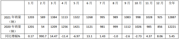 根据终端上牌数据,2021年12月,全国考斯特客车(含6米及以上,下同)销售925辆,同比增长8.06%; 2021年考斯特客车累计销售12887辆,比2020年同期的12221辆增长5.45%。现对2021年考斯特客车市场特点简要盘点分析。