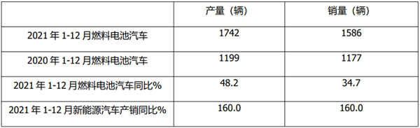 根据中汽协数据,2021年12月燃料电池汽车产销同比统计: