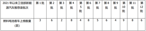 根据工信部数据,截止目前2021年累计发布的12批新能源客车推荐目录中燃料电池客车上榜车型数量统计