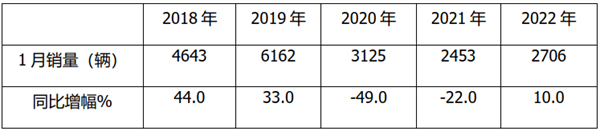 上表显示,2022年1月大型客车销量2706辆,居近5年1月销量的第二低(第一低是2021年1月的2453辆)。从同比增幅看,2022年1月同比增长10%,居于增幅第三大的年份(第一大是2018年1月增幅44%,第二大是2019年1月增幅为33%)。