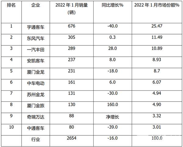 根据中汽协数据,2022年1月中型客车销量排行: