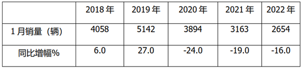 上表显示,2022年1月中型客车销量2664辆,居近5年1月销量最低,比第二低的去年1月的3163辆还要少509辆。从同比增幅看,2022年1月同比下降16%,居于近5年1月降幅第二大的年份(降幅第一大是2020年1月的24%,第二大是2021年1月的19%)。