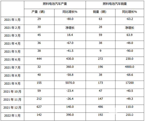 根据中汽协数据,2022年1月燃料电池汽车产销同比统计: