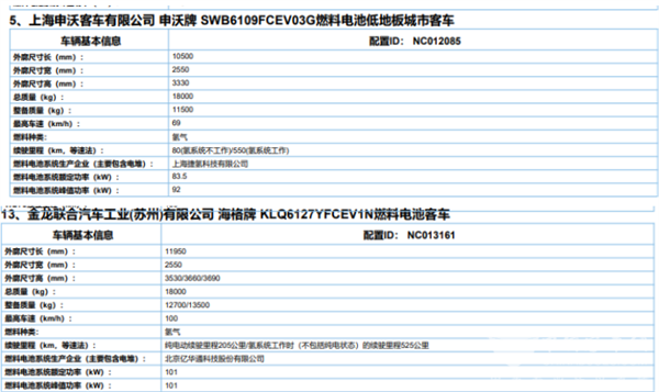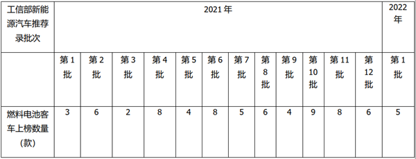 上表可见,在2022年1月工信部发布的2022年第一批新能源客车推荐目录中,燃料电池客车上榜5款(见下截图),在近期目录中算是较少的,但同比去年第一批上榜的3款增长66.7%。