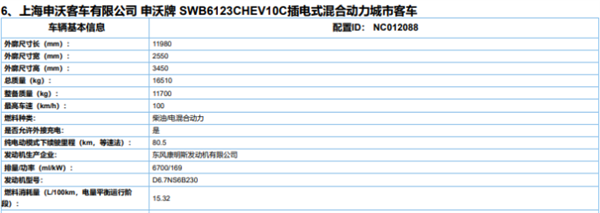 插电式混合动力客车上榜1款,占比3.85%,具体是上海申沃上榜的 12米插电式混动城市客车。